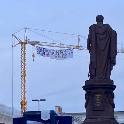 Baukräne stellen immer wieder eine hübsche Möglichkeit dar, um Botschaften auf Bannern über der ganzen Stadt zu spreaden.